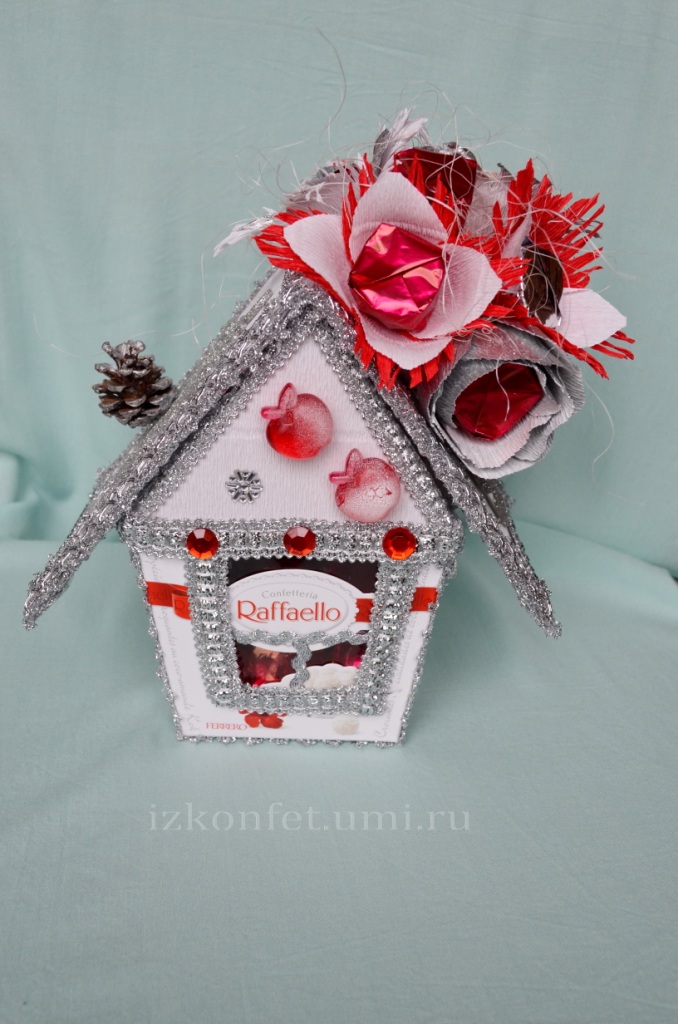Сказочные домики изготавливаются из коробки рафаэло. Конфеты остаются внутри и легко достаются. Одна часть крыши поднимается.